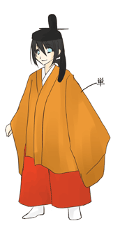 この単は狩衣の時などにも着用されたから、その時は束帯の時よりは多少派手になることが多かった。ちなみに今回の絵で色がオレンジぽくなっているが、これは次に着用する「衵」も同じ紅色であるから、わかりやすくするためにあえて変えたわけだ。間違えたわけではないぞ。そしてこの時足元には表袴も用意してある状態になっている。