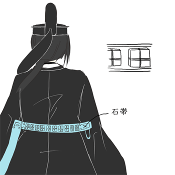この石帯は分かりやすく水色で示した部分だが、要するにベルトのようなものだ。少なくとも平安時代は今と同じように一本で構成されていたようなのだが、図のように二手に分かれたのは鎌倉時代以降のことだ。ただ多くの場合、紹介されている「石帯」はこの二手に分かれているものばかりなので絵としてはこちらを採用したということを最初に述べておく。